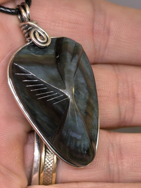 Ce collier en obsidienne céleste naturelle est une pièce exceptionnelle, révélant de manière naturelle la forme d’une Vierge au cœur de la pierre. Légèrement taillé pour sublimer ses lignes et ses reflets, ce pendentif unique incarne à la fois la beauté brute de la nature et une forte dimension spirituelle.