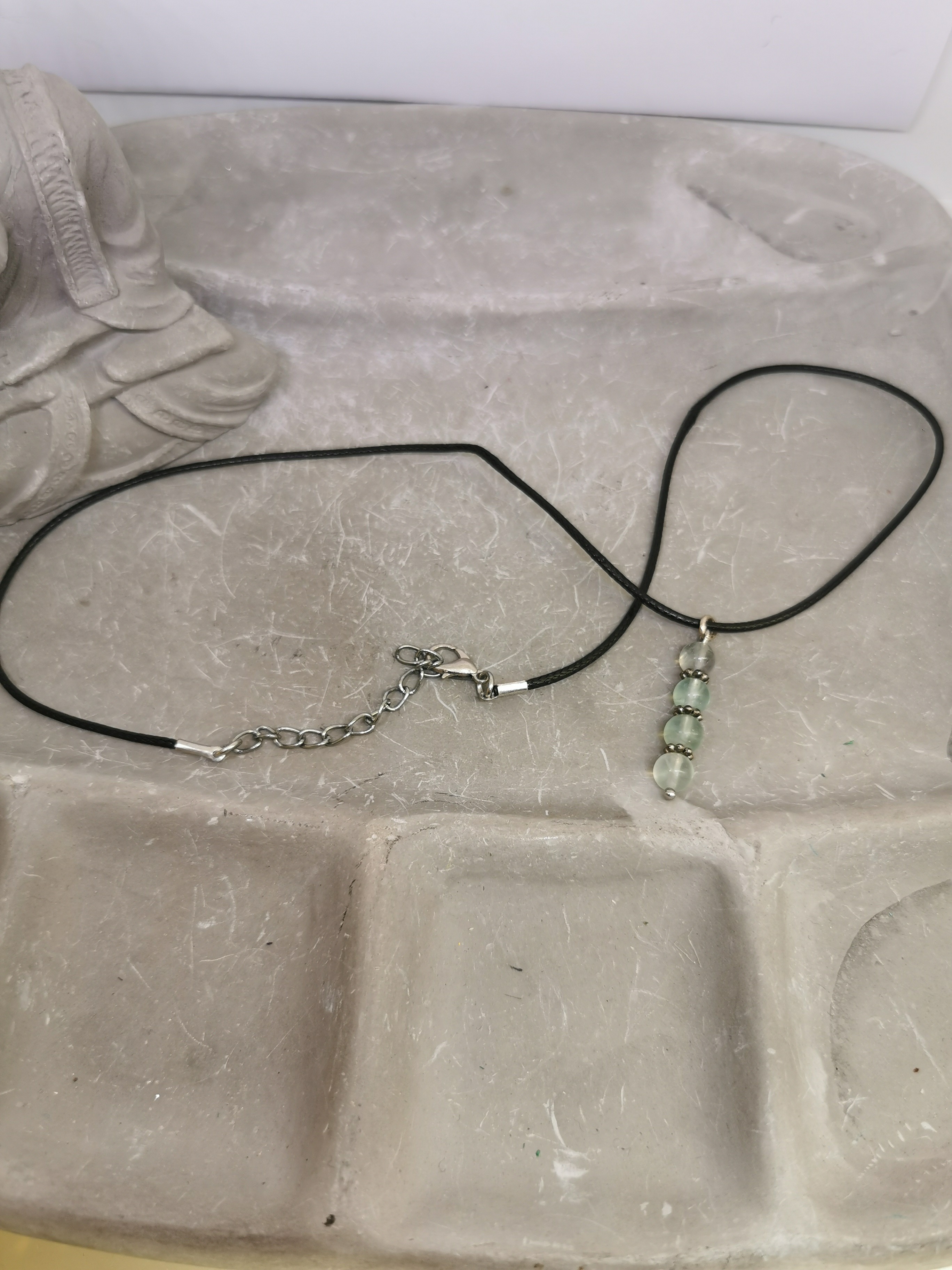 Ce collier en fluorine naturelle est un bijou à la fois sobre et puissant, composé de 4 perles de fluorine de 6 mm, élégamment espacées par des perles en zamac. Monté sur un cordon noir en cuir tressé réglable, il s’adapte parfaitement à toutes les morphologies.