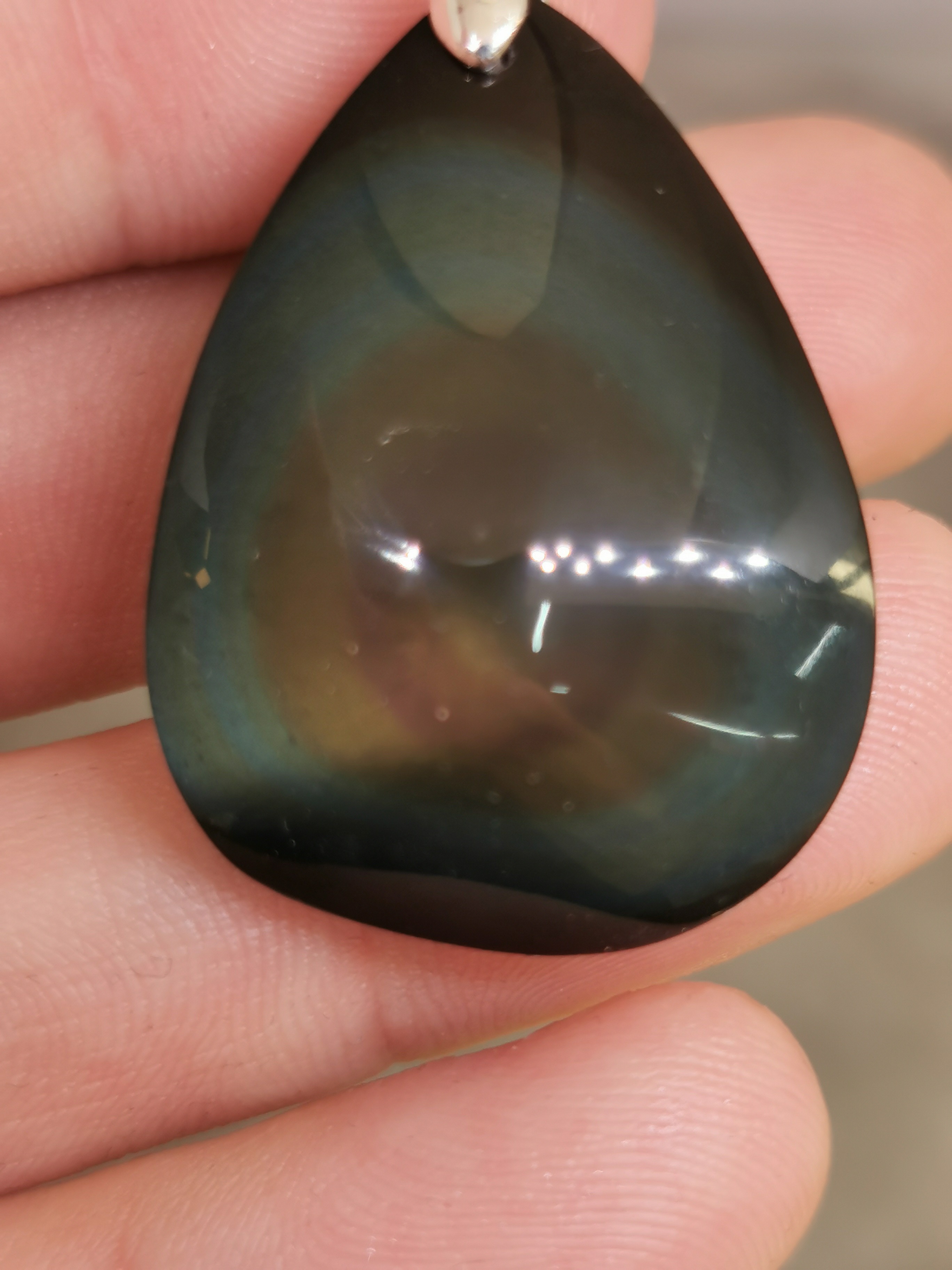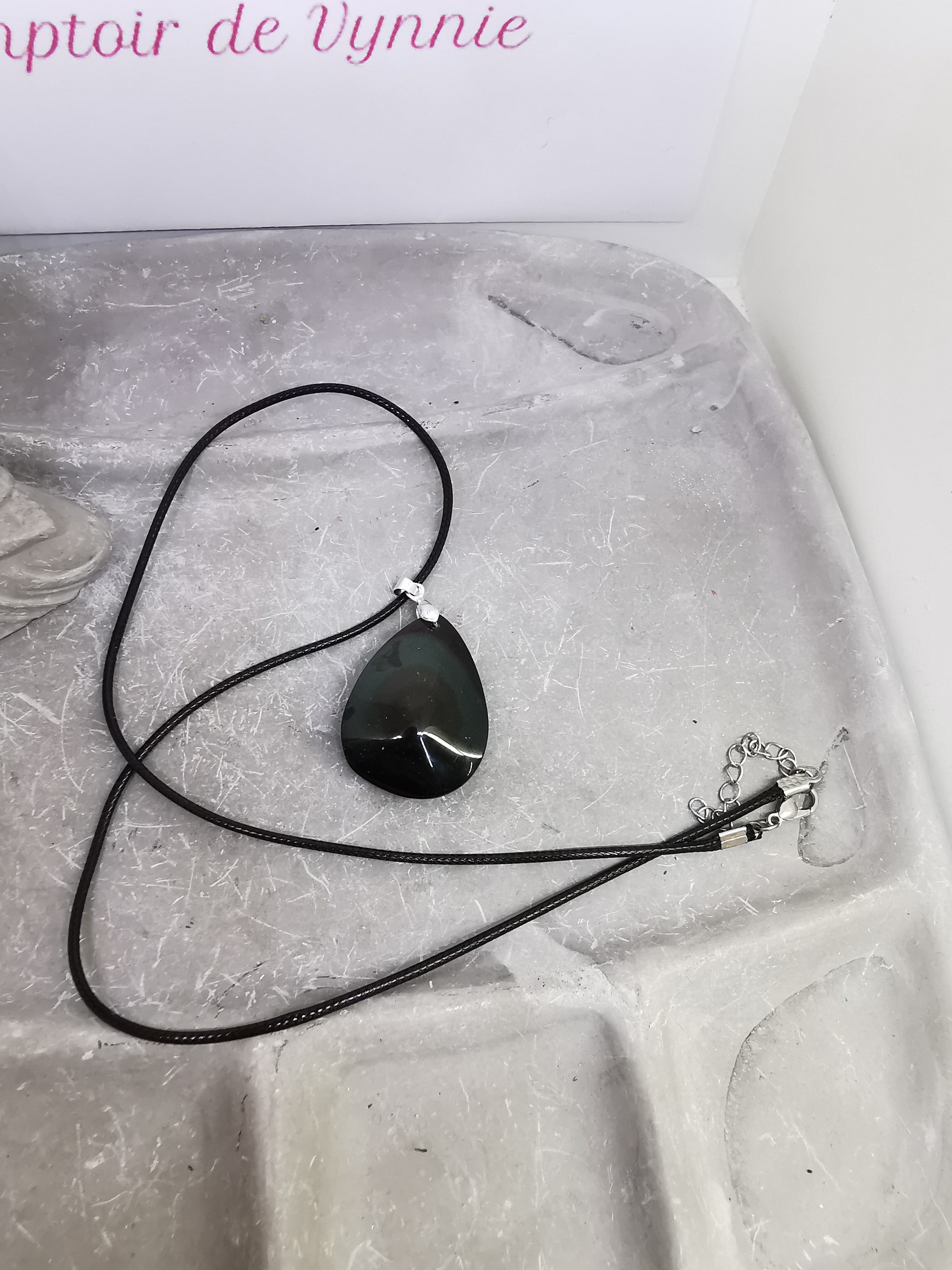 Ce pendentif en obsidienne arc-en-ciel naturelle est une pièce unique aux reflets profonds et captivants. Sa surface révèle de subtiles nuances bleutées, dorées et verdâtres, créant un effet visuel presque hypnotique qui évolue selon la lumière.