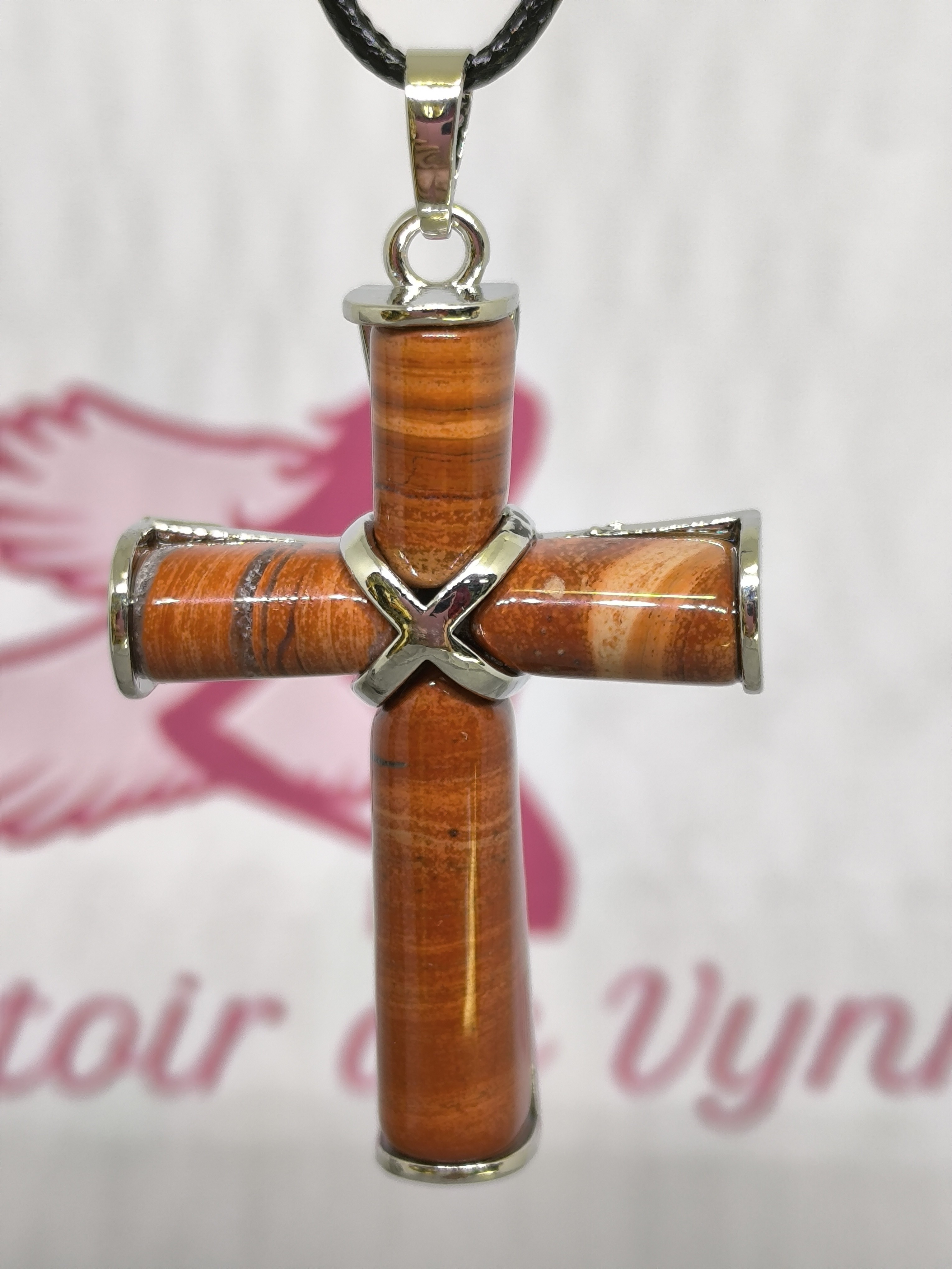Ce collier en pierre naturelle en forme de croix est conçu en jaspe rouge, une pierre reconnue en lithothérapie pour ses propriétés d’ancrage et de vitalité. Montée sur une structure en acier inoxydable avec un cordon noir en cuir tressé réglable, cette croix en jaspe rouge allie robustesse, élégance et énergie protectrice.