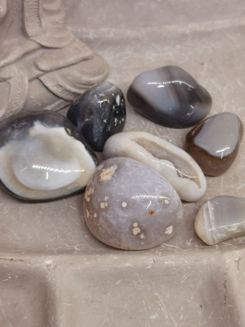 Chaque pierre roulée est unique, avec ses variations naturelles de couleurs et de textures, faisant de chaque pièce un objet à la fois esthétique et symbolique.