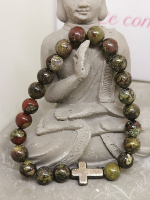 Bracelet Jaspe Dragon 8 mm avec Croix en Acier Inoxydable